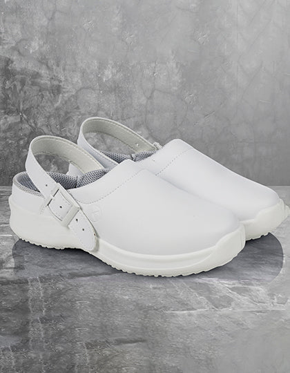 Obermaterial: Kunstleder | Innenmaterial: Textil | Einlegesohle: Schicht aus Kunststoffschaum bedeckt mit Textil | Laufsohle: Kunststoff | Unisex | Ohne Schutzkappe | Hinten offen, Fersenriemen mit Schnalle | Weich, robust, atmungsaktiv | Permanent antibakterielles Futter | PE-Einlegesohle | Antistatische PU-Sohle, rutschhemmend | Öl- und brennstofffest | Hohes Energieaufnahmevermögen im Fersenbereich | Waschbar bis 40 °C | EN ISO 20347:2012, OB-A-E-FO-SRC