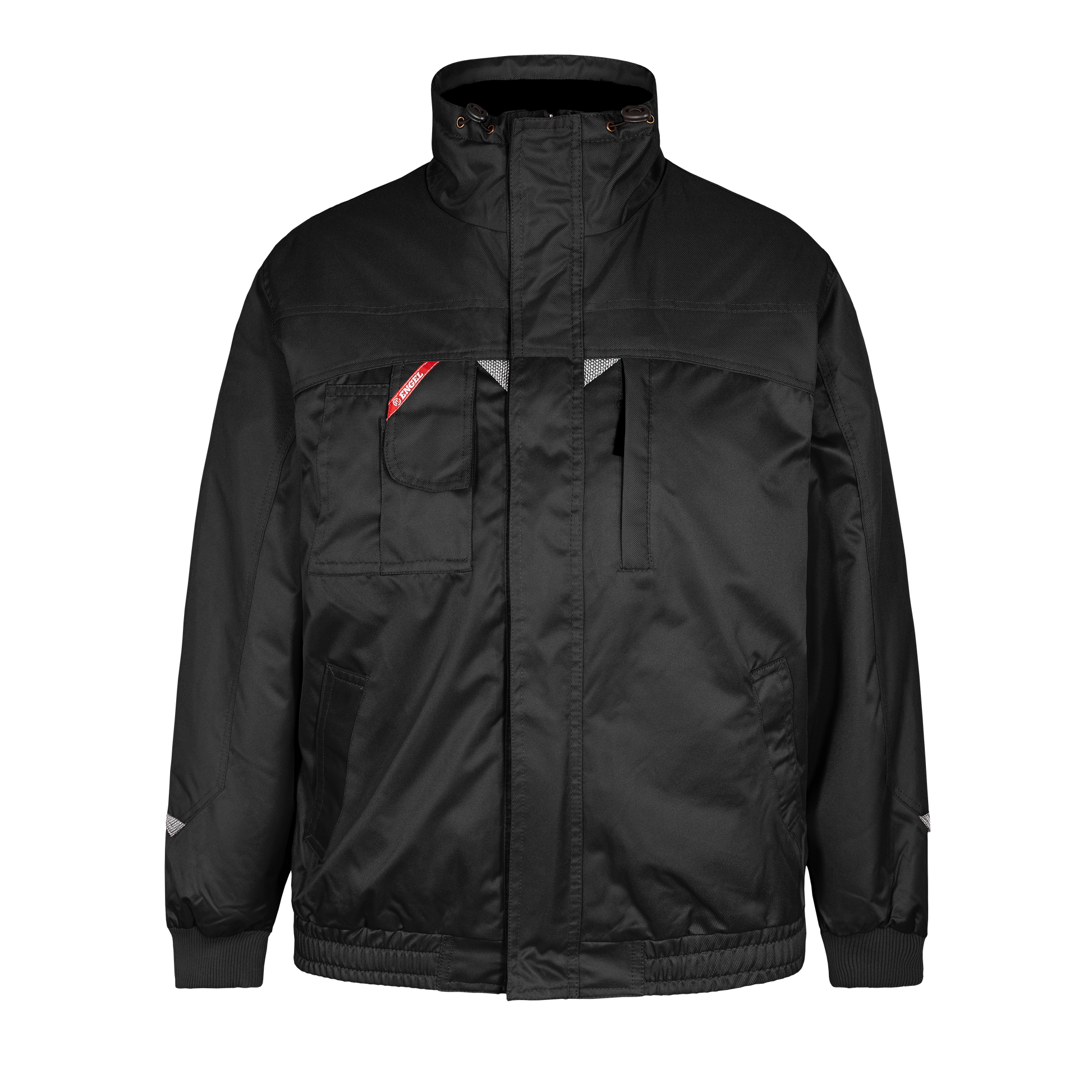 Pilotjacke mit doppelt verdecktem Kunststoffreißverschluss in passendem Farbdesign. Schultern und Ärmel verstärkt. Dunkel gefärbte Druckknöpfe. Brusttasche links mit seitlichem Eingriff mit Reißverschluss. Offene Brusttasche mit verschließbarer Handytasche rechts. Zwei Eingrifftaschen. Innentasche mit Reißverschluss. Strickbündchen an den Ärmeln. Elastischer Bund. Kragen mit Schnurstopper verstellbar. Faserpelz im Kragen und am Körper. Reißverschluss im hinteren, unteren Rückenbereich, um die Jacke für Transfers und Embleme leichter handhaben zu können. Wind- und wasserabweisendes Material.
