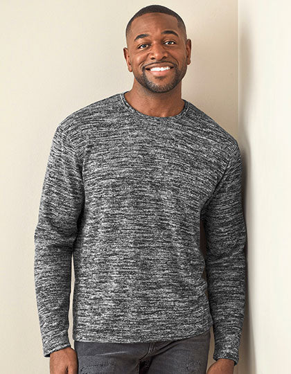 Eleganter Langarm-Pullover für Herren aus angenehm weichem Polyester-Viskose-Elasthan-Gemisch | Gebürstete Außenseite | Schmaler Kragen aus T-Shirt-Stoff | Necktape | Seitennähte | Kleines Größenetikett im Nacken | Pflegeetikett in der Seitennaht | Pflegeetikett in der Seitennaht