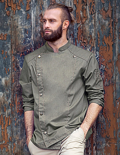 Köpergewebe, 195 g/m², Vintage Red: 175 g/m² | Hochveredelt, gekrumpft, waschecht, pflegeleicht | Kochjacke in Jeans-Optik mit schlanker Silhouette | Kontrastfarbige Steppnähte | Asymmetrisch geschlossene, einreihige 5-Knopf-Jacke mit Druckknöpfen | Ärmelmanschetten mit Schlitz | Aufgesetzte Ärmeltasche links mit Stiftfach | Industriewäschetauglich | Bis 95°C waschbar