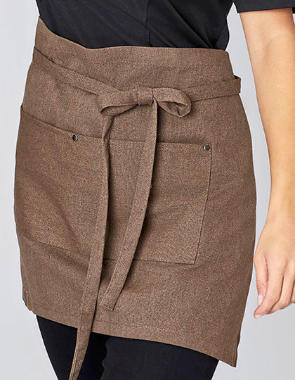 Latzschürze mit durchgehenden Stoffbändern | Verstellbares Kunstleder-Nackenband mit je zwei Druckknöpfen | Aufgesetzte Tasche mit zwei Fächern und Nieten |...