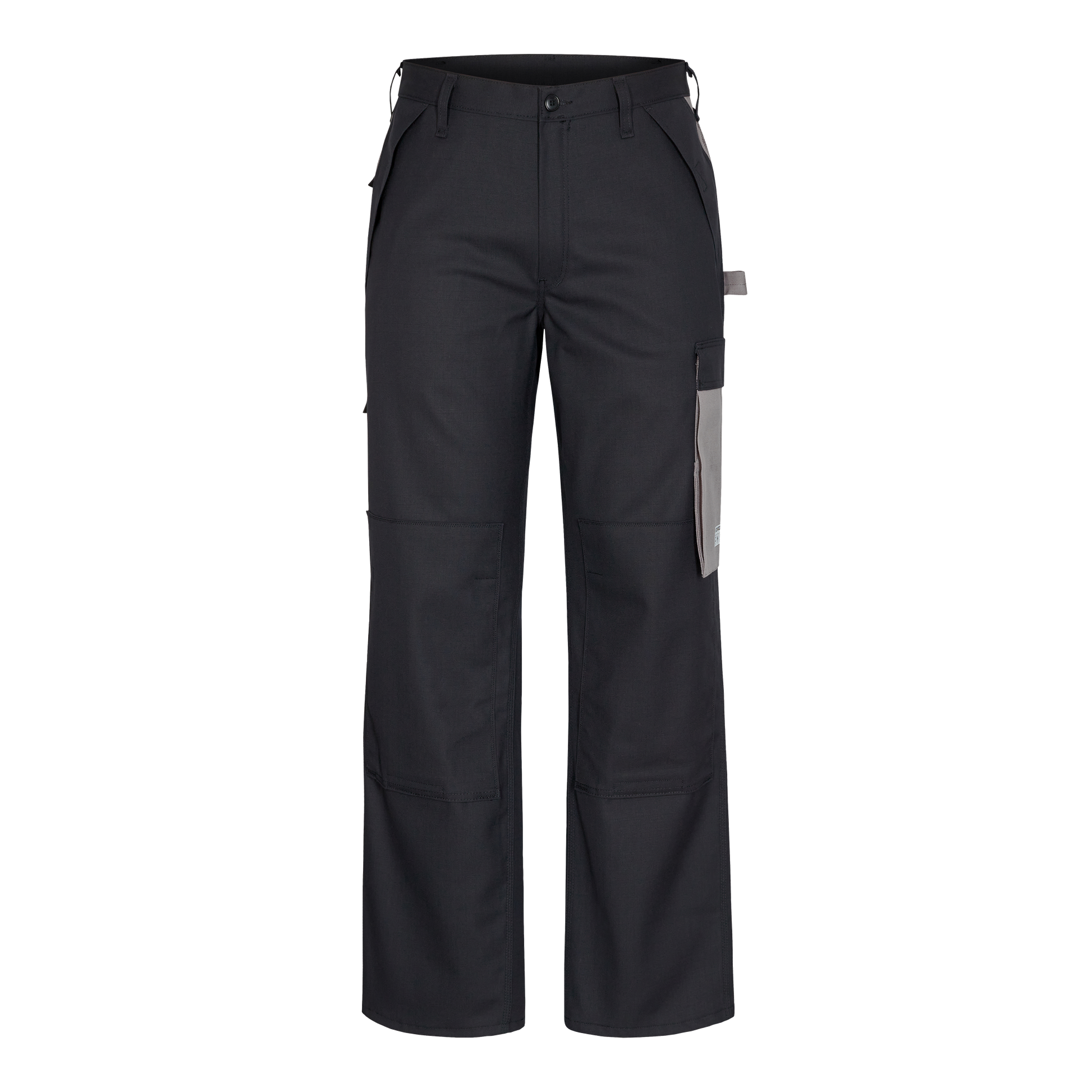 Bundhose mit zwei verdeckten Einschubtaschen. Verstärkte Gesäßtaschen mit Patte, Hammerschlaufe, Zollstocktasche, Knieverstärkung/Knietaschen mit Klettverschluss unten. Funktionelle Details bei Taschen und Bund verhindern das Festsetzen der Funken. Antistatisch, flammhemmend und schützend vor Aerosolen, Spray und leichten Spritzern von Chemikalien.