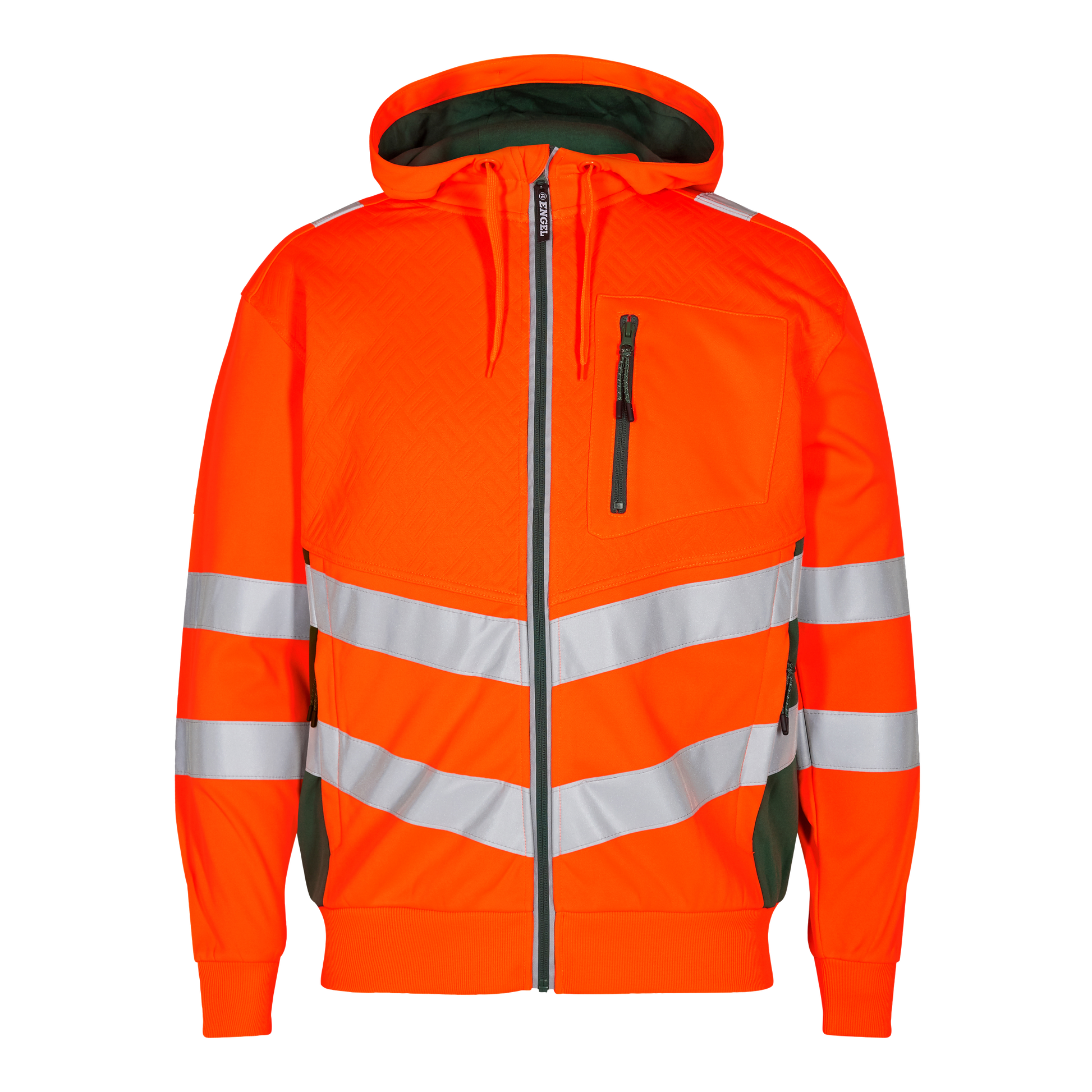 Funktionelle, fluoreszierende Sweatcardigan im modernen, attraktiven Design mit Stretchfutter. Leicht angerauter Innenseite, was den Stoff weich und angenehm macht. Reflektierender Reißverschluss vorne. Zwei geräumige Seitentaschen sowie eine Brusttasche, jeweils mit Reißverschluss. Die Sweat-Cardigan hat eine Waffelstruktur auf Vorderseite und Kapuze. Rippstrick an Ärmeln und Saum unten. Dehnbare Reflexstreifen über die Schulterpartie hinweg sowie rund um Ärmel und Taille. Bekleidungsklasse 2. Nach 25 mal Waschen getestet.
