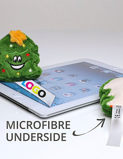Unterseite aus Mikrofaser zur Reinigung glatter Oberflächen, wie z.B. Handydisplays oder Bildschirme | Geschmacksmusterschutz EU-weit | Werbeanbringung erfolgt auf einem Fähnchen, das an der Produktunterseite befestigt ist