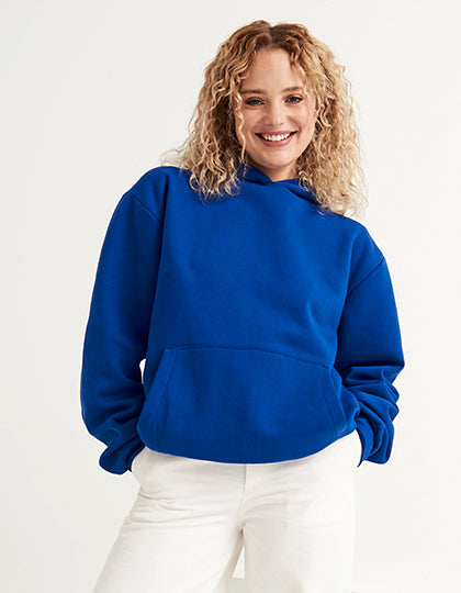 Ringgesponnene Baumwolle / recycelter Polyester | Oversize-Passform | Schweres Material | Doppellagige Kapuze mit drei Segmenten | Kängurutasche mit Handy-Innentasche | Keine Kordelzüge | Gerippte Ärmelabschlüsse und Saum | Gebürstetes Innenvlies | 100% Baumwollobermaterial | Abreißetikett